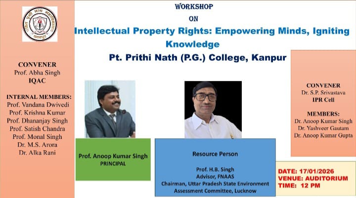 The workshop was formally inaugurated by Prof. Anoop Kumar Singh, Principal, P.P.N. (P.G.) College, Kanpur. In his inaugural address, he highlighted the critical role of IPR in protecting research outputs and innovations.